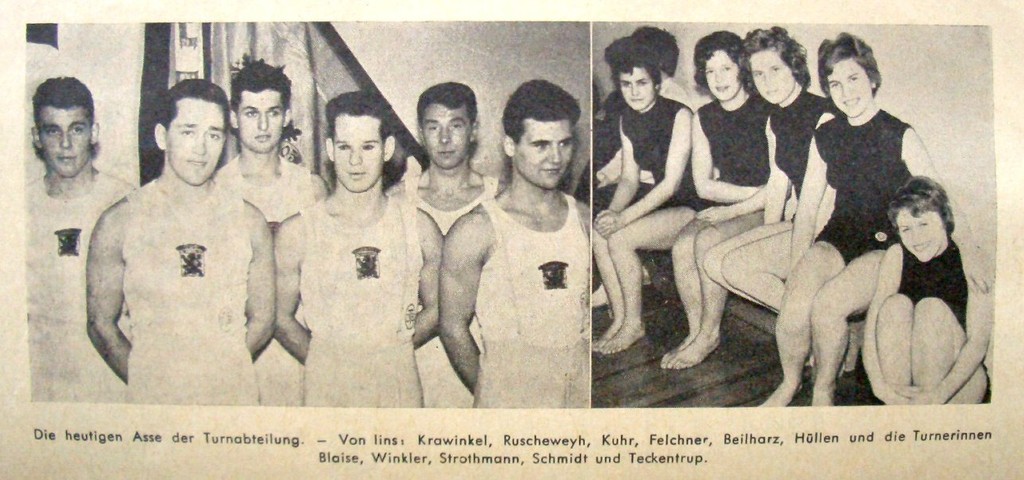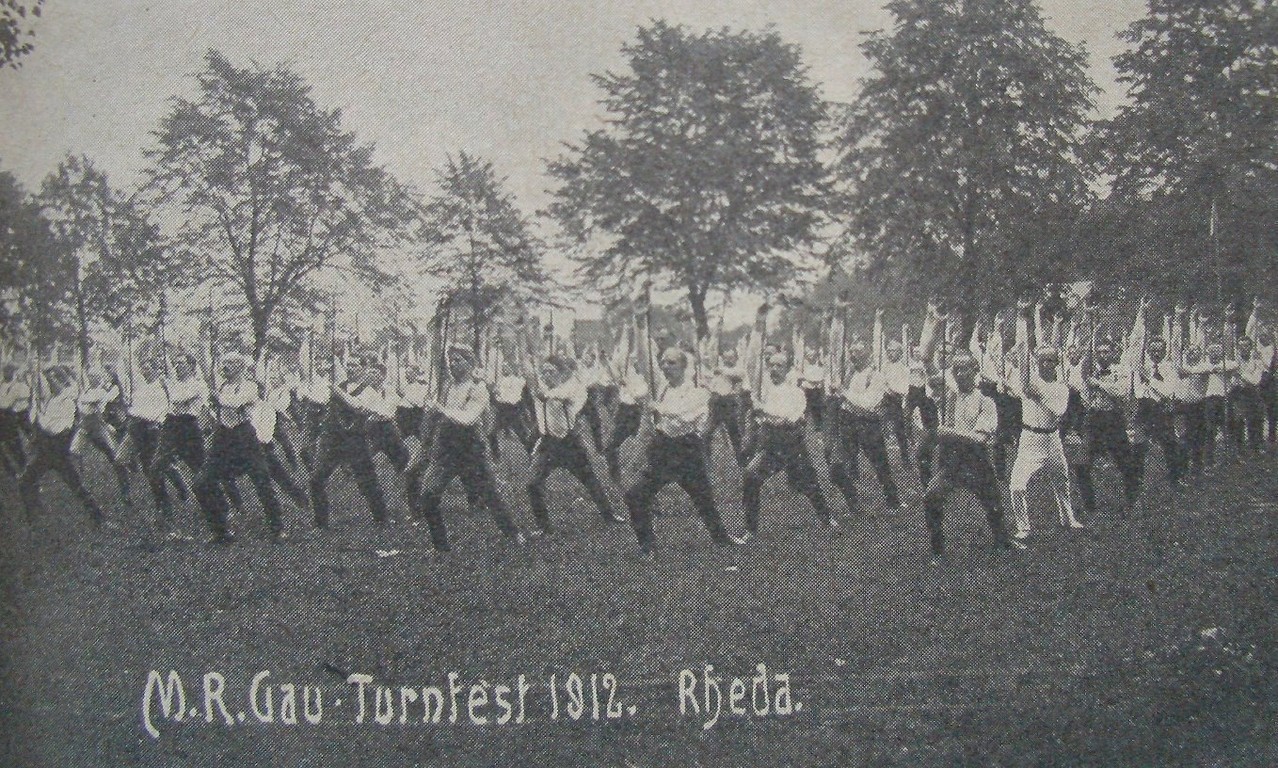 Auf den alten Turnverein von 1861 und damit auf das Turnen geht alle sportliche Tradition in Rheda zurück und wenn gleich im ersten Jahr des Bestehens ein Gauturnfest ausgerichtet wurde, dann spricht das für sich. Mindestens acht Gauturnfeste sind in Rheda durchgeführt worden: 1862,1872,1882,1994,1901,1912,1925 und 1957. Möglicherweise waren es noch mehr, denn viele Unterlagen fehlen uns heute. Leider erzählen die vorhandenen Protokolle nur sehr wenig über die rein turnerischen Erfolge. Es steht aber fest, dass schon imvorigen Jahr-hundert schöne Siege bei Turnfesten verschiedenster Größenordnung errungen wurden.Es tauchten Namen von Wettkämpfern um die Jahrhundertwende auf. Da hatten die Rhedaraner bereits Klasseturner. An allererster Stelle muß dabei Salomon Goldschmidt genannt werden. Goldschmidt, ein äußerlich unscheinbarer kleiner Mann, hatte ein Spezial-gerät: das Reck, welches zu seiner Glanzzeit noch eine Holzstange hatte. Goldschmidt turnte auf kleinen Festen sensationell wirkende Schwierigkeiten und er galt für alle Experten als bester Reckturner Westfalens. Aber auch andere Rhedaraner wurden größe Könner. Wie eine Bombe schlug es im ganzen Turngau ein, als 1929 zunächst eine Gaumeisterschaft durch die Rhedaraner Riege in der Landesklasse errungen wurde. In den beiden folgenden Jahren starteten die Turner dann in der höchsten Klasse und gewannen widerum vor so starken Vereinen wie Bielefelder TG 1848, Güthersloher TV, Herford, Minden etc. Das war vom Erfolg hergesehen die größte Zeit der Rhedaraner Turngeschichte. Die „Stars“ an den Geräten waren in diesem Zeitraum und teilweise bis in den letzten Weltkrieg hinein: Heinrich und Albert Kosfeld, Walter Friedrich, Erich Lütkemaas, Willy Kuhlmann, Fritz Rabe, Heinrich, Sandfort, Franz Wonnemann und Gerhard Steiling. Gerhard Steiling war in den dreißiger Jahren ein Mann von Spitzenklasse, der mehrfach zu repräsentativen Aufgaben herangezogen wurde und auch in der Westfalen-auswahl turnte. „Sein“ Gerät war das Seitpferd, das heute für viele Turner zur tückischen Stolperecke in Mehrkämpfen geworden ist.„Sein“ Gerät war das Seitpferd, das heute für viele Turner zur tückischen Stolperecke in Mehrkämpfen geworden ist. In der Turnhalle am Werl,dem heutigen Werlkönig,die das Turnen seit 1913 erst richtig auf Hochtouren brachte, herrschte ein geradezu unwahrscheinlicher Hochbetrieb. Der Andrang war vor allem bei den unteren Jahrgängen so stark, dass die Halle wegen Überfüllung geschlossenwerden musste. Auch eine sehr leistungsstarke Damenriege wurde aufgebaut. Für sie zeichnete sich Gustav Schildmann verantwortlich. Der Nachkriegsgeschichte im Rhedaraner Turnen aber drückte eine Frau ihren Stempel auf: Else Hoffmann, Rhedas ewig junge Turnmutti. Weil aber die „Vorkriegs.Kanonen“ nicht so mitzogen, wie es wünschensert gewesen wäre, gab es ein laufendes Auf und Ab. Aus den einst jungen Männern waren inzwischen von Terminen gejagte Handwerksmeister, Manager und Akkordarbeiter geworden. Vielleicht war in ihnen auch das einstige Feuer der inneren Begeisterung restlos ausgebrannt. Einige traten beim Deutschen Turnfest 1953 in Hamburg noch einmal an und kamen mit sieben Siegerkränzen heim. Turnfest-sieger waren Hilde Müller,Else Hoffmann, Heinrich Sandfort, Hans und Reiner Felchner, Gerhard Steiling und Franz Wonnemann, der von den „Alten“ der Treueste war.Der nächste Aufschwung setzte erst Anfang der Sechzigerjahre ein. Jugendturner waren zur Selbsthilfe geschritten. Allen voran Reiner Felchner, Werner Krawinkel und Hans Ruscheweyh. Die Jungen wurden Leiter und Aktive in einer Person. Sie resignierten nicht, obwohl sie so gerne ältere Turnbrüder als Berater bei sich gehabt hätten. Diese aber kamen über Versprechungen nicht heraus. Das istvielleicht das dunkelste Kapitel der Vereinsära. Trotzdem stieg die nun soblutjunge Abteilung in Größe und Breite wie Phönix aus der Asche.Großartige Veranstaltungen wurden in Rheda aufgezogen. Dabei zeigten sichReiner Felgner& Co als wahre Organisations-künstler. Den Gaukunstturnmeisterschaften folgten das westfälische Ausscheidungsturnen der Turnerinnenund 1961 die Westfälischen Kunstturnmeisterschaften mit den deutschen Turnassen Lyhs, Kloska, Narres, Schäfer usw.Filius Reiner Felchner trat dann1959 in die Fußstapfen von Papa Hans. Sein Idealismus kannte keine Grenzen, obwohl ihn das berufliche Streben starkAnspruch nahm.Reiner fand die Zeit, in der Nachbarschaft Vorturner auszubildenund Vereinen, in denen das Turnen völlig zu Erligen kam, wieder „auf die Beine“zu helfen. Zu diesem Zeitpunkt war Reiner gerade 22 Lenze alt. Wenn er sich ausschließlich seiner eigenen turnerischen Fortbildung gewidmet hätte, so wäre aus ihm sicher ein Kunstturner der Spitzenklasse geworden ! Beim 100 jährigen Jubiläum verzeichnet die Turnabteilung 237 Turner(innen).„Zukunftssorgen wird die Turnabteilung bei den Verantwortlichen WernerKrawinkel, Hans Ruscheweyh, Reinhard Kuhr, Sigrid Schmidt, Gunnar Hüllen,Ulrike Winkler, um nur einige Namen aus dem „Stab Felchner“ zu nennen, nichthaben“ so die Worte bei der Jubiläumsfeier. Um die Jüngsten kümmerte sich nach wie vor Else Hoffmann, bei der auch Petra Beckstett (heutige Abteilungsleiterin 2012) ihre ersten turnerischen Versuche mit weiteren 40 Mädchen, in der Werlturnhalle, machte. Bis 1975 waren dann verschiedene Übungsleiterinnen für diedamalige Breitensportabteilung tätig.